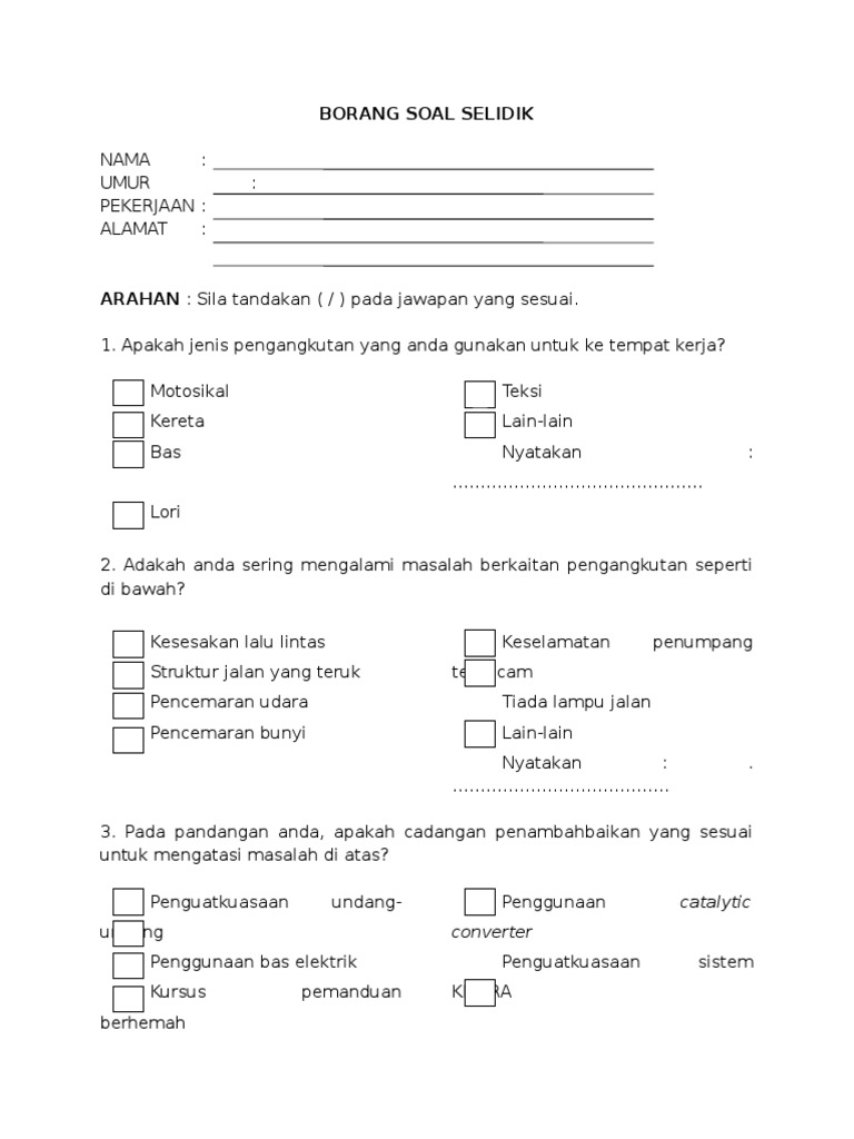 Borang Soal Selidik from imgv2-1-f.scribdassets.com Apakah punca utama pencemaran udara dikawasan tempat tinggal anda ? Borang soal selidik geografi pt3 2017. Contoh terbaik contoh jawapan tugasan geografi pt3 2016 pengangkutan. Kaedah kajian yang digunakan dalam tugasan ini adalah borang soal selidik. Borang temubual soalan kajian guna tanah. Contoh borang soal selidik pencemaran udara toast nuances via toastnuances contoh borang soal selidik geografi pt3 tugasan 2018 via mypt3 contoh kerja kursus geografi 20111 via slideshare contoh jawapan tugasan sejarah pt3 2014 tingkatan 3 via upcomingcarshq. Pada pendapat anda, apakah punca pencemaran udara di kawasan anda? Contoh soalan soal selidik pencemaran alam sekitar soalan aw.