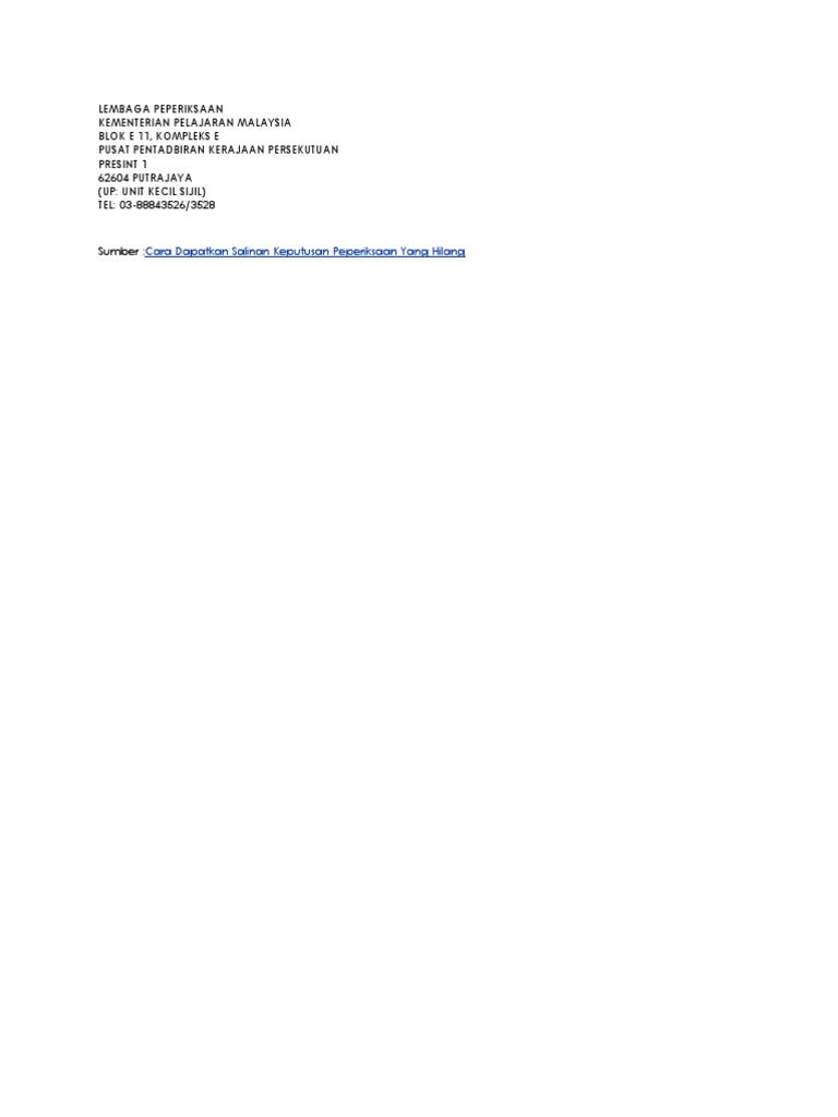 Lembaga peperiksaan kementerian pendidikan malaysia aras 2 , blok e11, kompleks e, pusat pentadbiran kerajaan persekutuan, 62604, putrajaya, malaysia.