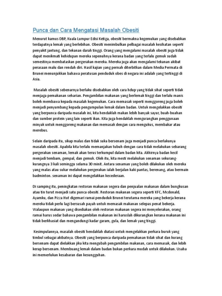 Punca Dan Cara Mengatasi Masalah Obesiti from fisyayusof.com Dari situ, kita akan menerangkan bahawa salah satu punca berdengkur adalah berat badan berlebihan, yang biasanya tidak diketahui oleh. Cara mengatasi masalah sakit belakang. Stress merupakan perkataan pinjaman yang berasal daripada perkataan bahasa inggeris, stress yang membawa maksud tekanan, titik berat, dan ketegangan. Macam mana cara untuk mengatasi obesiti, iaitu masalah badan gemuk melampau? Pernah tak anda rasa seperti bertambah dua kilo setiap kali selepas makan? Obesiti boleh dikawal atau diatasi dengan mengubah gaya hidup. Ketahuilah punca penyakit resdung dan cara merawatnya dengan berkesan. Sebenarnya, faktor berlakunya kegemukan bukan sahaja kerana pemakanan tetapi turut melibatkan beberapa perkara yang lain.
